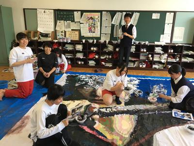 4月27日(土)、いよいよ連続10日間という今年のゴールデンウィークが始まりました。美術・デザイン専攻生は、体育祭に向けて団席パネルの制作が本格化しています。パネルの大きさは約3m×4mと大きくて大変ですが、パネルリーダーの指揮の下、毎日の当番を決め、仕事を手分けして、和気あいあいと作業ができており、どの学年も順調な様子です。中でも3年生は、全学年分のペンキや刷毛等の手配や購入まで、きめ細かく対応してくれるしっかり者揃いです。みんなで協力して、いい絵を仕上げて体育祭を盛り上げよう!(文責:弘)