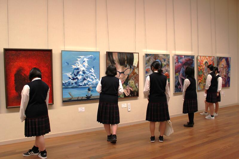 本日の授業では1年の美術専攻生と熊本県立美術館本館へ行き、高校美術展を鑑賞しました。