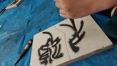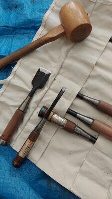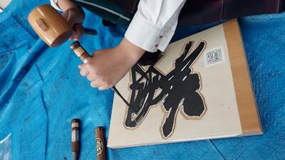 現在④の作業を行っています。ノミに木槌を当て「カーン!カーン!」と音を立てて掘っていきます。