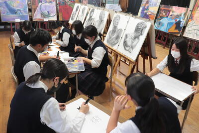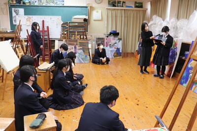令和6年1月11日(木)3年生の絵画の授業で、卒業制作の内覧会を行いました。4人1組のグループに分かれて意見を出し合い、全体の前で発表しました。とても有意義な時間になりました。