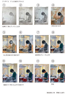 令和6年1月18日(木)1年生初めての油絵ではグリザイユの技法を学びます。本校3年生の伊藤さんが後輩のために、グリザイユで制作したF50油彩の制作過程を記録してくれました。文献や分かりやすい記録が無く、参考になるものが少ない貴重な資料です。しっかりと学んでくださいね。