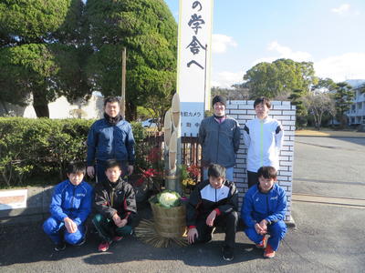 今年は今日12月27日(金)が学校の仕事納めとなります。学校では、進学課外授業を受ける生徒たちや部活動に励む生徒たちの姿が見られます。朝から、有志職員とハンドボール部の男子生徒4人で、門松づくりが行われました。例年関わってこられた渡部先生(数学)の段取りがよく、およそ1時間でできあがり、正門前に立ちました。門松は、新しい年の神様が天から降りてこられる目標(「依代(よりしろ)」と言います)となるものです。これで、私達の学校も新年を迎える準備が整ったわけです。