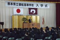 令和2年度、御船高校は4月8日(水)から始動しました。午前に新3年生と新2年生の始業式、午後に入学式を行いました。今年度、183人の新入生を迎え、全校生徒が525人です。そして、教職員が77人(非常勤8人含む)となります。全職員で生徒一人ひとりを支え、可能性を引き出す教育に努め、「自立と共生」の力を生徒たちに養っていく所存です。保護者のみなさまと学校は車の両輪のような関係にあると考えます。生徒の心身の成長という大きな目標に向かって同じ方向に連帯して進んで行きたいと思います。今年度も、保護者のみなさまには本校の教育活動に対して、ご理解とご協力のほどを宜しくお願いいたします。