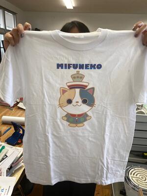 令和5年10月4日(水)芸術コース美術2年生が制作した、御船高校イメージキャラクターの中から、採用キャラクターを1作品選びました。選ばれた作品がこの「ミフネコ」です。このTシャツは、電子機械科が次回参加する、水中ロボット競技会で生徒が着用するユニフォームとなる予定です。