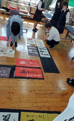 ※揮毫後、全ての作品を鑑賞してまわる本校生徒