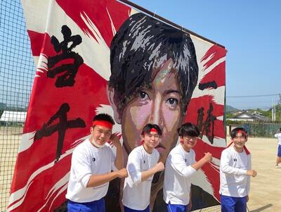 体育祭の団画の前で記念撮影です