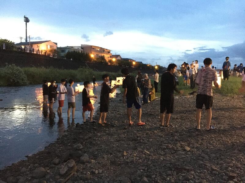 辺りが暗くなり、クライマックスの精霊船流しです。提灯の点火や運搬のお手伝いをしました。