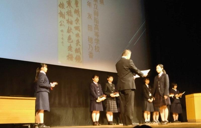 熊本県書道連盟会長の講評では、作品のまとめ方、墨色美、線の力強さが効果的と、本校作品について評していただきました。