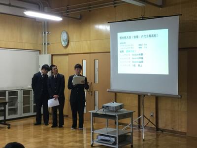 朝礼では、6月15日(土)・16日(日)に実施された「 第16回熊本県高校生ものづくりコンテスト」の結果報告がありました。