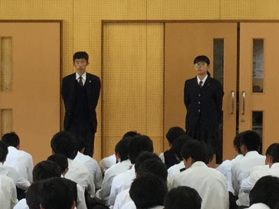 2月5日(火)、生徒会主催の全校朝礼がありました。まず、生徒会長・野仲さんが本校の定めている「インターネット10カ条」について説明し、インターネットやスマートフォンの適切な使用について呼びかけました。続いて各委員会からの連絡があり、図書委員長・佐方さんからは図書返却ボックスの新設と利用について、交通副委員長・鍬田さんからは二重ロックの徹底について、生徒副会長・荒瀬さんからは2月の目標「1年間の総まとめ」について、それぞれ説明がありました。最後はいつもどおり校歌斉唱で締めくくりました。