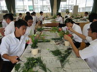 家庭科の授業では、毎年、本校華道部の外部講師の村上諫先生を講師としてお招きし、フラワーアレンジメント講習会を実施しています。今日は、3年B組(電子機械科)の家庭総合の授業で講習会を実施しました。フラワーアレンジメントは初めてという生徒が多かったですが、生徒たちは、思い切りよく生けており、どの生徒も上手に完成させていました。今後、1年生普通科クラスでも実施します。