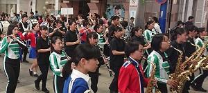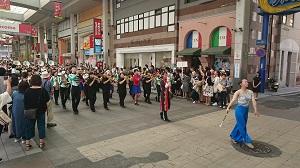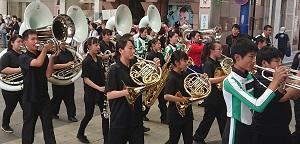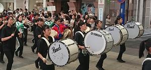 本校は「熊本合同チーム」の一員として、熊本国府高校、熊本中央高校、熊本農業高校の皆さんとともにパレードに参加しました。本番は合同練習の成果もあり、みんな揃った足並みで、元気よく、楽しく演奏することができました。見物、応援に来られたアーケードのお客様方にも大きな拍手をいただき、喜んでいただきました。