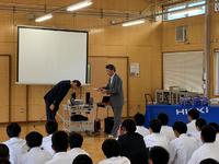 大嶌社長からは生徒全員に「みやざき中央新聞」とメッセージ入りのカレンダーをいただきました。ありがとうございました。