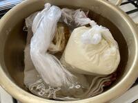 ビニル袋が鍋肌に付かないように、鍋の中に布巾を敷いています。