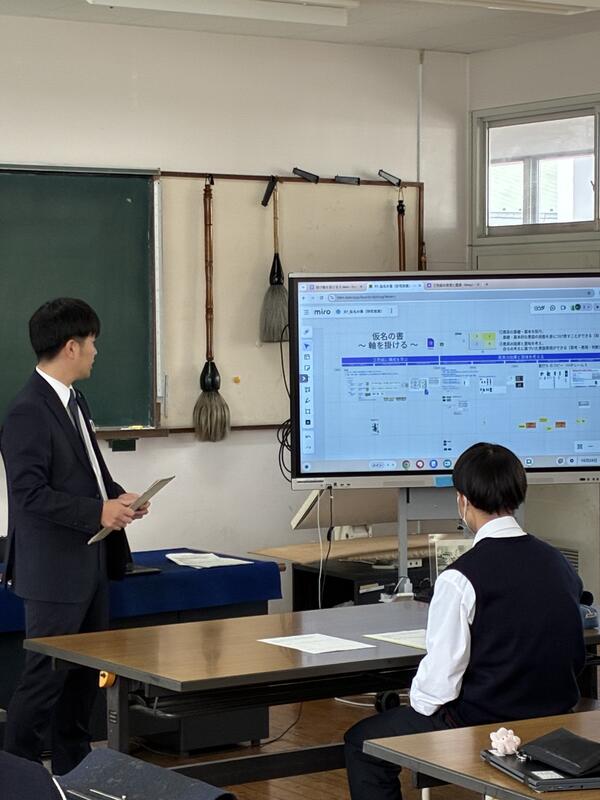 黒岩教諭がICT機器を用いて「表装の意図と表装がもたらす効果」について説明した後、本校3年芸術コースの書道選択者が自身の作品の制作意図について1人ずつ発表し、各班で作品を考察し、内容をまとめ、共有していました。