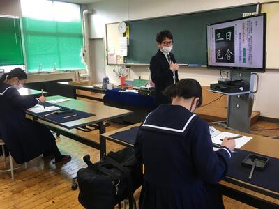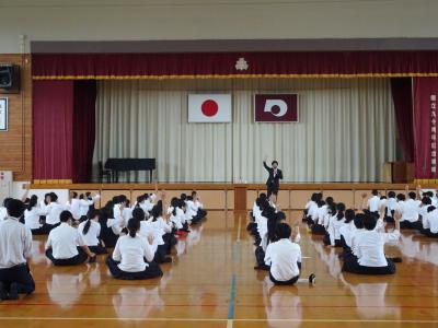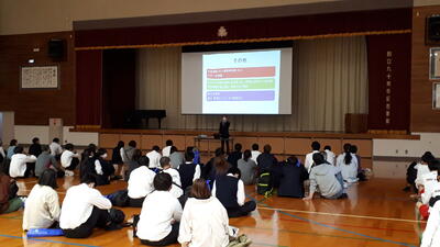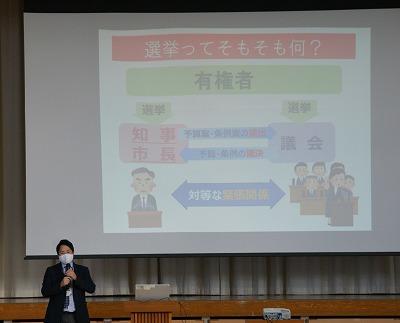 12月16日(水)、熊本県選挙管理委員会、御船町選挙管理委員会、NPO法人ドットジェイピー熊本支部のみなさまの協力のもと、3年生は「主権者教育出前講座」を受けました。はじめに、熊本県選挙管理委員会の奥田様から、選挙クイズを交えた講話をしていただきました。近年の投票率の低迷、とりわけ若い世代の投票率の低さが切実な問題であることを、改めて考える機会となりました。