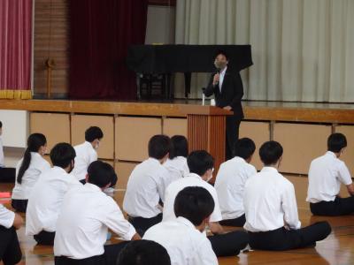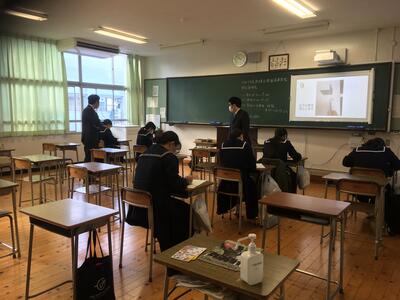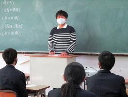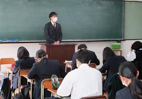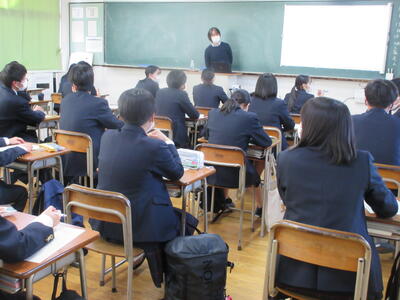 2月22日(月)、1年普通科(特進クラス、総合クラス、芸術コース)では「先輩の合格体験に学ぶ会」を開きました。今年進路を決めた3年生4名と、卒業生1名に各教室を回ってもらい、進路決定までの歩みを語ってもらいました。毎日の学習の進め方、志望先決定までの取組、進路決定までの努力・工夫・苦労、後輩たちへのアドバイスなど貴重な体験談を聴くことができました。1年生にとっては、進路決定に向けて意識を高める良い機会となりました。いよいよ2年生に進級します。自己の夢・進路実現のため、一つ上の学校生活を目指してほしいと思います。