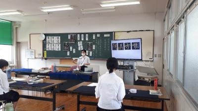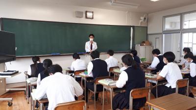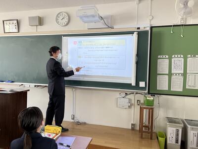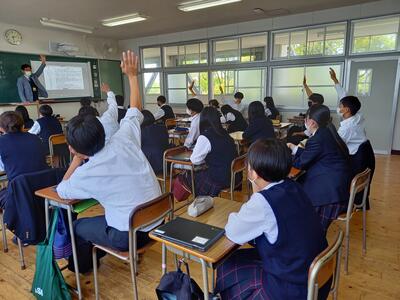 前半は「台湾を知ろう」と題して、台湾と日本、台湾と熊本の共通点などを説明していただきました。生徒たちが台湾について知っていることと言えばタピオカくらいだったので、台湾と日本が地理的にとても近く、台湾の人たちは日本に対して興味関心が強いことを聞いて驚いていました。後半は「国際社会と台湾」と題して、台湾の歴史について詳しく教えていただきました。最後に、文化の異なる人たちとより良い関係を構築するためには、「相手の歴史を正しく知ること」と「相手のアイデンティティを尊重すること」がとても大切だと説明してくださいました。異文化の人と共生するためには、外国語の習得は勿論ですが、よく知ること、よく学ぶことが大切だと改めて感じることができました。