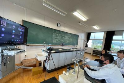 今日は1年特進クラスで「特進コース出張講義」を実施しました。例年、1年特進クラスは大学訪問を行っていましたが、新型コロナウイルス感染拡大により今年度も大学訪問が困難になり、大学の先生に出張講義に来ていただく形式となりました。本日は、崇城大学工学部ナノサイエンス学科より西田正志准教授に来ていただき、講義や実験を体験しました。