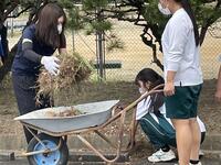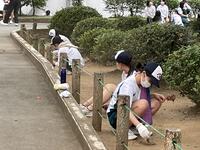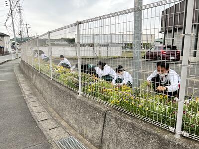 弓道部です。時々弓道場の花壇の雑草を間引いているのですが、雑草が少ないところは、金曜日の強い風雨で写真のように花が倒れています。雑草には雑草の役目があるのだなと思いました。