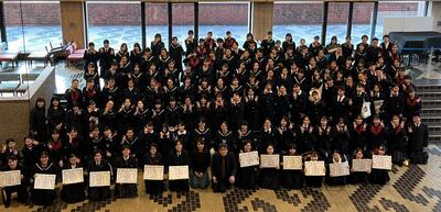 コーラス部が12月15日(水)、第46回全国高等学校総合文化祭東京大会音楽専門部県代表選考会に「火の国くまもと合唱団2022」(14校・約150名)のメンバーとして出場し、金賞を受賞しました。また、来年の全国高等学校総合文化祭東京大会への代表として推薦を受けることができました。