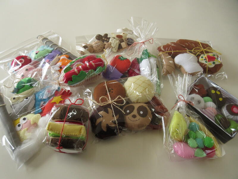 魚釣り遊びやお店屋さん遊びがたくさんできるように、パンやフルーツ、クッキー、ハンバーガーなど、ミシンを使わずに全て手縫いで仕上げています。