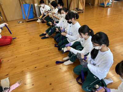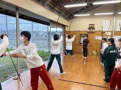 弓道部です。今日は1年生が初めて弽をつけました。(弽は弦から右手を保護するものです。)