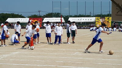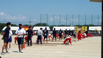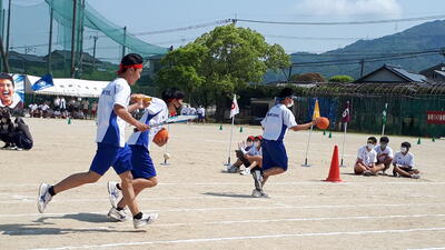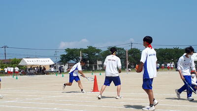 竹の棒を4人で持ち、息を合わせてコーンを回りながら、棒を次の組に渡して行く競技。入学して1ヶ月の1年生のチームワークが試されます。