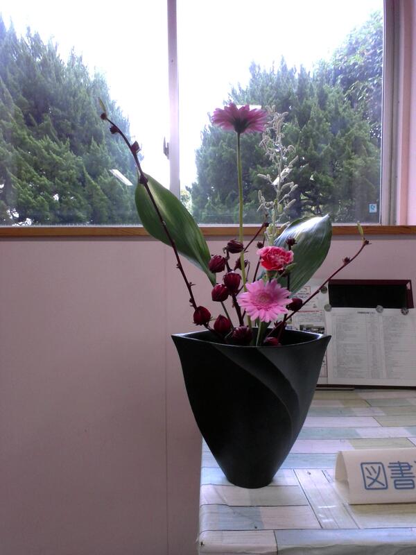 本校では華道部のお稽古のあと先生が生けた作品を事務室の前に飾っています。