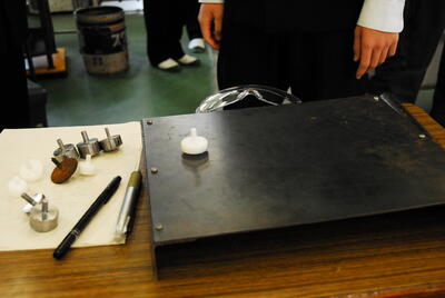 コマづくり体験 本校にはかなりの数の工作機械がそろっています。その中の一つ「旋盤」を実際に触っていただいてコマづくりを経験して頂きました。もちろん出来上がったオリジナルの作品は記念として自宅に持ち帰っていただきました。中学校では絶対にできない体験で電子機械科を知っていただけたのではないかな?と思います。