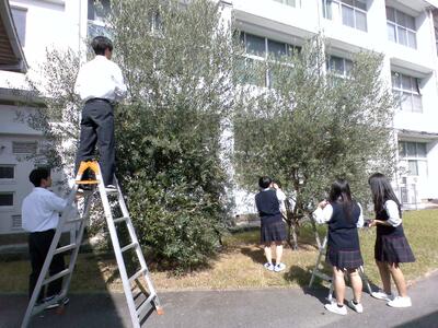 校舎横に大きなオリーブの木が2本あり、今年は沢山の実をつけました。夏には緑色をしていた実が完熟して黒くなってきたので、3年フードデザイン選択の生徒で収穫をしました。