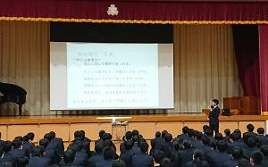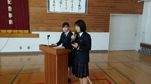 です。続いて、今年熊本県も大会会場となり実施される「南部九州総体2019」の準備状況や今後の計画について、県の高校生準備委員を務める野仲さんから報告がありました。次に1年田中さんより「インターネット10か条」についての保護者との協議結果について、さらに1年角川さんより3月の目標「1年間の総まとめ」について、それぞれ報告と呼びかけがありました。