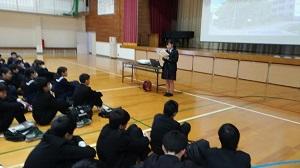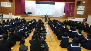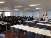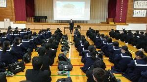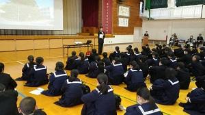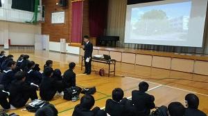 3限目は体育館で、生徒会からの学校説明、普通科、芸術コース、電子機械科の御船中出身の緒方さん、三浦さん、緒方君から、各学科コースの魅力等の説明がありました。半日の体験入学でしたが、御船高校の雰囲気を感じてもらえたでしょうか?今後の皆さんの進路選択の参考にしてください。御船高校の生徒・職員一同、皆さんの入学をお待ちしています。