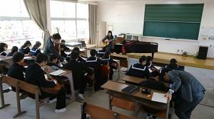 3月14日(木)、今日は御船中学校の2年生128人が本校を訪問し、高校の授業の体験をしました。体育館での開会式の後、1限目は6班に分かれて、国語、英語、美術、音楽、書道、電子機械の授業に参加しました。