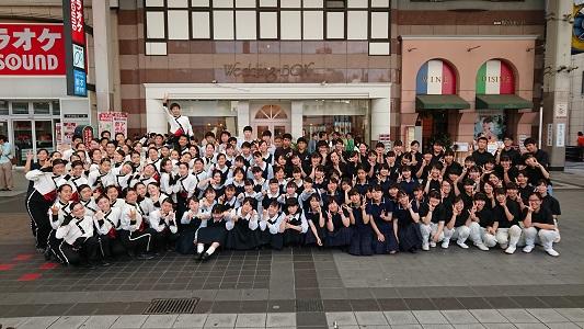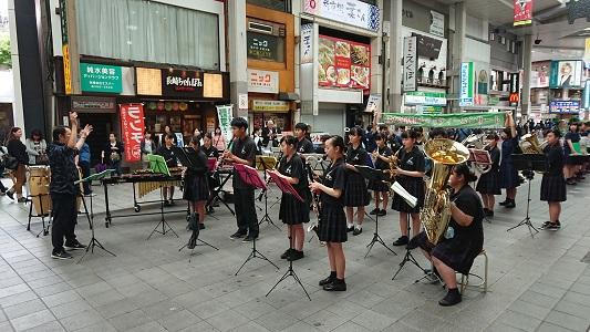 6月15日(土)、吹奏楽部が熊本市新市街アーケードで行われたチャリティーコンサートに出演しました。参加したのは「熊本地震復興支援2019、第4回熊本城復旧チャリティーコンサート」というチャリティーイベントで、本校吹奏楽部のほか慶誠高校、熊本国府高校、熊本中央高校、熊本農業高校の吹奏楽部がそれぞれ演奏を披露しました。本校吹奏楽部は「ひまわり」「Lemon」「ピースサイン」「ウィーアー!」「サンバ・テンペラード」「世界はあなたに笑いかけている」と盛りだくさんの6曲を元気いっぱい演奏し、新市街の買い物客など聴き手の皆様から温かい拍手をいただき、喜んでいただきました。コンサート最後には5校合同で「うたエール」を演奏、熊本地震復興への思いをお客様とともに歌いました。コンサート中は熊本中央高校のボランティアの生徒を中心に募金活動を行い、多くの支援をいただきました。集まった募金は、熊本市に寄付されます。ありがとうございました。
