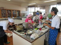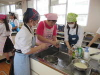 本校では、毎年、家庭科の授業で、御船町の食生活改善推進員(愛称:ヘルスメイト)さん達を講師として招き、郷土料理の調理実習を実施しています。今年も、水前寺菜(御船町では「御船川」という名称で生産・販売を促進しています)を利用した郷土料理の実習をしました。本日は、2年4組の授業に5名のヘルスメイトさんが来てくださいました。そのうち2名のヘルスメイトさんは、お孫さんが本校に在籍中ということでした。いろいろな話をしながら楽しく実習をさせていただきました。来週も各クラスで調理実習が続きます。