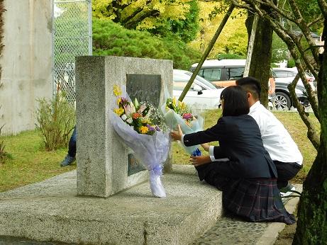 10月25日(金)11:00~殉難の碑前(本校正門付近)において慰霊祭が行われました。この行事は本校同窓会の伝統的な行事であり、昭和19年10月25日に学徒動員によって長崎大村の海軍航空廠で命を落とされた本校生(旧制御船中学校)の先輩10名と学徒動員先で病死された1名の先輩方のご冥福をお祈りする行事です。