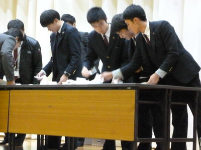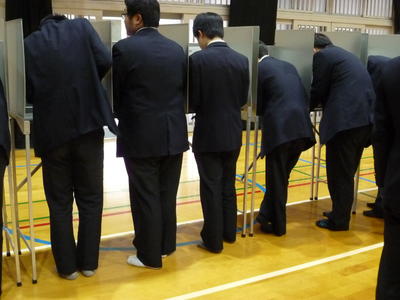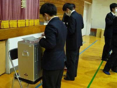 12月18日(水)、熊本県選挙管理委員会及び御船町選挙管理委員会の協力を得て、本校体育館で「熊本県知事選挙」の模擬投票会を実施しました。本物の記帳大、投票箱、そして「折り曲げても必ず開く」投票用紙に生徒たちは興味津々です。DVDで3人の候補者の公約を視聴した後、一人ずつ投票用紙を受け取って投票をしました。各クラスの学級委員長が「選挙管理委員」となり、開票作業も行いました。開票結果が発表されると、拍手が起こったりガッツポーズをする生徒がいたり、「当事者」の表情を見せてくれました。3月にある本当の県知事選挙にも必ず行ってくれるものと思います。選挙の仕組みや、選挙で選ばれた人たちが税金の使い方を決めているということを御講話下さった選挙管理委員会や税務署の方々に感謝申し上げます。