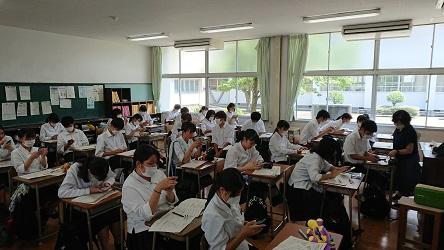 大掃除後で校舎はすっかり新鮮な空気となり、アブラゼミの鳴く声が天神の森からこだまする中、終業式は「令和2年度7月豪雨災害」追悼の黙祷から始まりました。校長先生からこの1学期とコロナ禍の現在を踏まえたお話、生徒指導部の蔵土先生から夏休みの過ごし方、そして、これまで生徒会長として全校生徒を引っ張ってきた3年の田中さんの挨拶が続き、生徒の皆さんはそれぞれ静かに耳を傾けていました。
