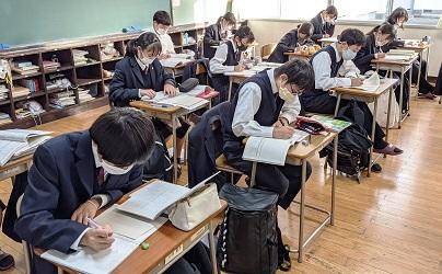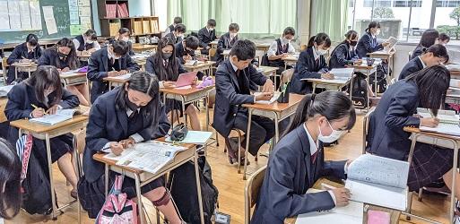本校は11月30日(月)から期末考査になります。考査直前の今週、1年生では「考査前学習会」に取り組んでいます。いつもは終礼で放課となる時間に30分間、クラス全員で自学に取り組みます。たった30分間ですが、集中して勉強する互いの姿によって緊張感を高め、頑張り抜く励みにもしてほしいと願っています。そして家庭学習も充実させ、復習を重ねて、考査当日は力を出し切ってほしいと思います。