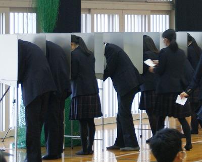 12月16日(水)、熊本県選挙管理委員会、御船町選挙管理委員会、NPO法人ドットジェイピー熊本支部のみなさまの協力のもと、3年生は「主権者教育出前講座」を受けました。はじめに、熊本県選挙管理委員会の奥田様から、選挙クイズを交えた講話をしていただきました。近年の投票率の低迷、とりわけ若い世代の投票率の低さが切実な問題であることを、改めて考える機会となりました。