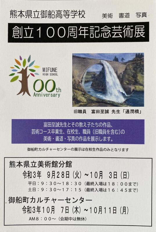 9月28日から10月3日まで、県立美術館分館で御船高校創立100周年記念芸術展を開催いたします。