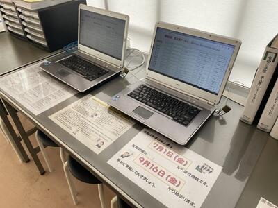 進路指導室前の廊下にて就職の求人情報を観覧することができます。今年の求人受付は7月1日金曜日からです。昨年の分はパソコンで見ることができますので積極的に活用してください。