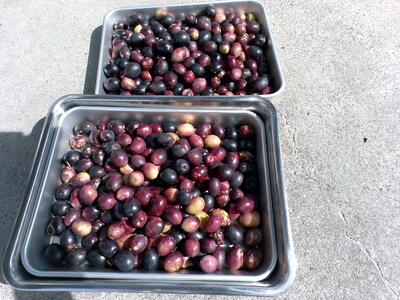 校舎横に大きなオリーブの木が2本あり、今年は沢山の実をつけました。夏には緑色をしていた実が完熟して黒くなってきたので、3年フードデザイン選択の生徒で収穫をしました。