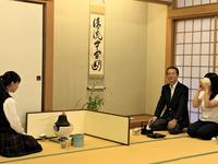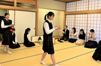 裏千家の風炉(ふろ)の薄茶平手前で私たちはもてなされました。亭主の田上さんは幾つもの手順を落ち着いて進め、まことに優美なお手前を披露しました。相客にお菓子やお茶を運ぶ部員も楚々とした所作でした。日常の学校生活では決して見ることのできない立ち居振る舞いであり、御船高校生の未知の姿を「再発見」した思いとなりました。