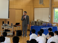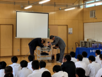 本校電子機械科のラボ棟(実験実習棟)において、同科の3年生67人と職員で出迎え、贈呈式を執り行いました。細谷社長様からは、「高校生の皆さんに物作りの楽しさを知って欲しい。そして、かつての技術立国日本を取り戻すために将来活躍して欲しい」と励ましの言葉を頂きました。贈呈式の後、日置電機株式会社の社員の方による「電気測定の基礎知識」のセミナーが30分ほど行われ、生徒にとっては貴重な学習の機会となりました。