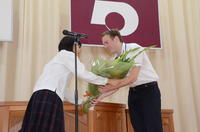 ディラン先生のスピーチの後に、生徒会長の田中美璃亜さん(2年B組)が生徒代表の感謝の言葉を述べ、花束を贈呈しました。そして、ステージにコーラス部の生徒6人が登壇し、音楽の岡田先生の指揮、前村先生のピアノで、アイルランドの歌「ダニー・ボーイ」(別名:ロンドンデリーの歌)を合唱しました。アイルランドの民謡は旋律が優しく、明治時代から日本人には親しまれてきました。特に、1913年(大正2年)に発表されたこの歌は、戦場に息子を送った母の思いが表現されていて、その切ないメロディと歌詞は国境を越えて共感を呼び、我が国でも歌い継がれてきています。花束を持ったまま壇上の椅子に座り、コーラス部の歌声にじっと耳を傾けるディラン先生。目頭を幾度か押さえる様子が見られました。異国の地で聴く祖国の民謡はディラン先生の心に深く響いたことでしょう。