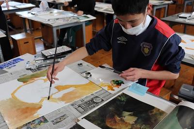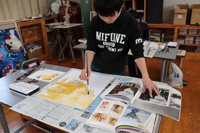 美術・デザイン専攻1年生の初めての体験となる油彩画が始まりました。今回は有名な巨匠について調べ、作品を模写することで油彩画の特性や描き方の違いなどを理解するものです。実際に描くとなると、画集を見る生徒たち目も真剣そのものです。ゴッホやモネ、ルノワールなど、それぞれがお気に入りの画家を選び、色使いや筆致、画面構成などを詳しく分析しながら取り組んでいます。