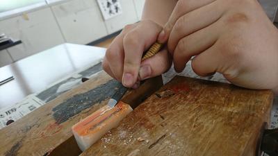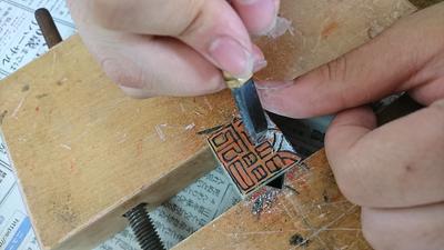 刀法の練習を済ませ、いよいよ本番です。印材に布字した文字を丁寧に刻していきます。
