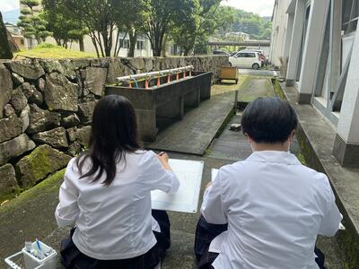 令和4年5月31日、今日は5月最後の日です。朝から2年生は校内風景画の課題に取り組んでいます。山々や石垣、木々など絵になる題材がたくさん御船にはあります。